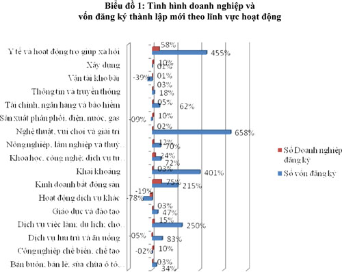 Theo lĩnh vực hoạt động, tỷ lệ doanh nghiệp thành lập mới giảm ở 02 ngành nghề so với cùng kỳ năm 2016, đó là: Hoạt động dịch vụ khác đăng ký 66 doanh nghiệp, giảm 18,5% và Dịch vụ lưu trú và ăn uống đăng ký 453 doanh nghiệp, giảm 4,8%. Các ngành nghề còn lại đều có số doanh nghiệp thành lập mới tăng so với cùng kỳ năm trước (Biểu đồ 1).
