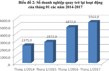 Số doanh nghiệp quay trở lại hoạt động trong tháng 01/2017 là 5.564 doanh nghiệp, tăng 14,2% so với cùng kỳ năm trước. So sánh số doanh nghiệp quay trở lại hoạt động của tháng đầu năm trong những năm gần đây tại qua các năm, thì số doanh nghiệp quay trở lại hoạt động ngày càng gia tăng và tháng 01/2017 có số doanh nghiệp quay trở lại cao nhất (Biểu đồ 2).