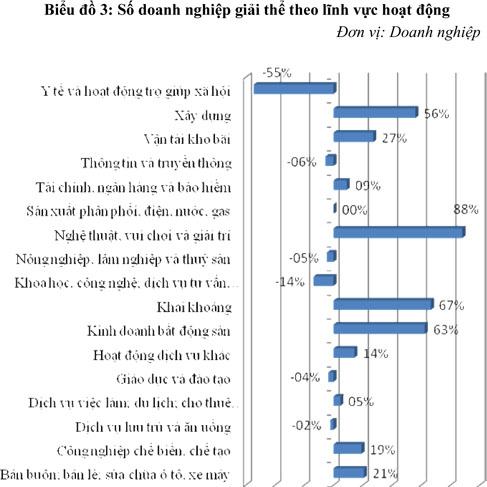 Phân theo lĩnh vực hoạt động, trong tháng 01/2017, một số ngành, lĩnh vực có tình hình doanh nghiệp giải thể giảm so với cùng kỳ năm trước, bao gồm: Y tế và hoạt động trợ giúp xã hội có 5 doanh nghiệp, giảm 54,5%; Khoa học, công nghệ; dịch vụ, tư vấn; quảng cáo và chuyên môn khác có 57 doanh nghiệp, giảm 13,6%; Thông tin và truyền thông có 50 doanh nghiệp, giảm 5,7%; Nông nghiệp, lâm nghiệp và thủy sản có 84 doanh nghiệp, giảm 4,5%; Giáo dục và đào tạo có 27 doanh nghiệp, giảm 3,6% và Dịch vụ lưu trú và ăn uống có 84 doanh nghiệp, giảm 2,3%. Các ngành, lĩnh vực còn lại đều có số doanh nghiệp giải thể tăng so với cùng kỳ năm 2016; riêng lĩnh vực Sản xuất phân phối, điện, nước, ga có lượng doanh nghiệp không thay đổi so với cùng kỳ năm 2016 (Biểu đồ 3)./.