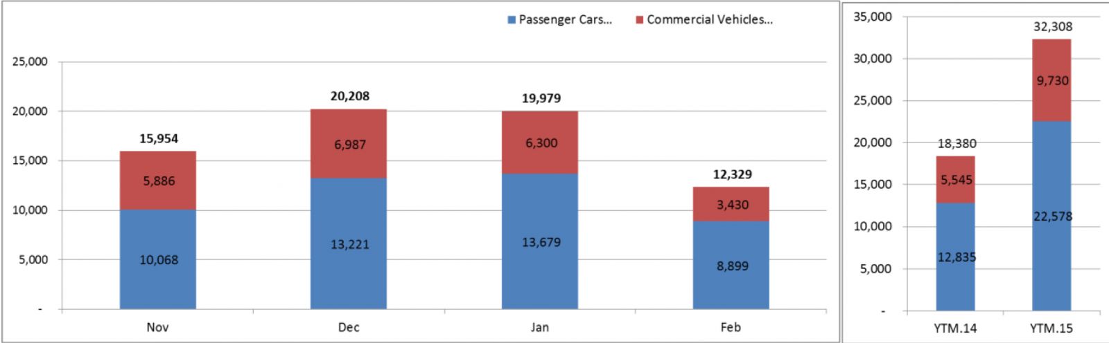 Theo đó, mức tiêu thụ trong tháng 2/2015 tăng 69% so với cùng kỳ năm 2014, với mức sản lượng tiêu thụ đạt 12.329 chiếc, bao gồm 8.899 xe du lịch và 3.430 xe thương mại. Tuy nhiên xét theo tháng thì sản lượng tiêu thụ có sự sụt giam đáng kể so với tháng 1/2015. Trong đó, doanh số xe du lịch giảm 35% và xe thương mại giảm 41% so với tháng trước. Nguyên nhân chính của hiện tượng này là do tính thời vụ của đối với sản phẩm này, nhu cầu mua sắm xe phục vụ nhu cầu đi lại trọng dịp Tết Nguyên đán đều tập trung trong tháng 1/2014, nên trong tháng 2 sản lượng tiêu thụ đã giảm, dễ nhận thấy nhất là sản lượng tiêu thụ xe con, xe du lịch.