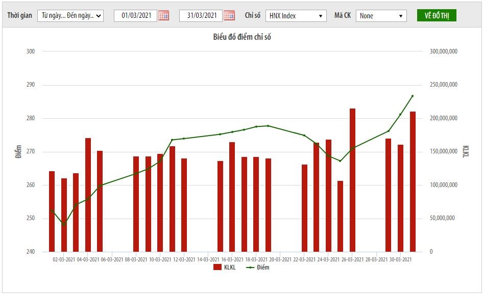 Thị trường cổ phiếu niêm yết trên HNX tiếp tục có diễn biến sôi động. Tại ngày giao dịch cuối cùng của tháng 3/2021, chỉ số HNX Index đạt 286,67 điểm, tăng 15,03% so với cuối tháng trước.