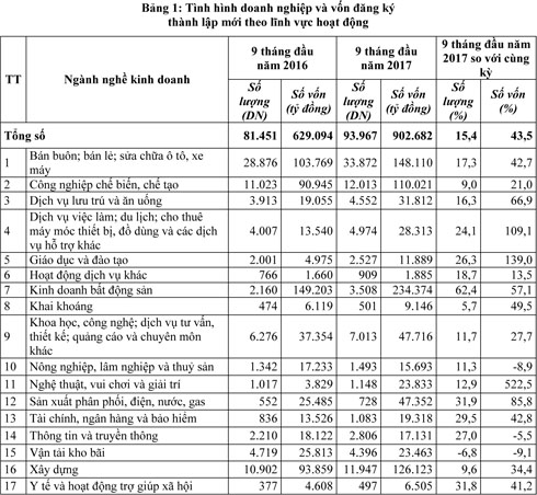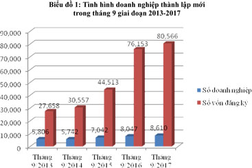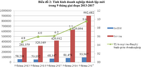 Tính chung 9 tháng đầu năm 2017, cả nước có thêm 93.967 doanh nghiệp thành lập mới với số vốn đăng ký là 902.682 tỷ đồng, tăng 15,4% về số doanh nghiệp và tăng 43,5% về số vốn đăng ký so với cùng kỳ năm 2016. Tỷ trọng vốn đăng ký bình quân trên một doanh nghiệp trong 9 tháng đầu năm 2017 đạt 9,6 tỷ đồng, tăng 24,4% so với cùng kỳ năm trước.