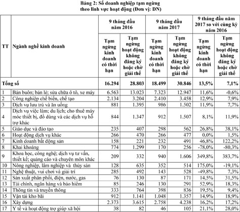 Về tình hình doanh nghiệp tạm ngừng kinh doanh, cả nước có 52.345 doanh nghiệp. Trong đó, tạm ngừng kinh doanh có thời là 18.499 doanh nghiệp, tăng 13,5% so với cùng kỳ năm 2016; tạm ngừng hoạt động không đăng ký hoặc chờ giải thể của cả nước là 30.846 doanh nghiệp, tăng 7,1% so với cùng kỳ năm trước.