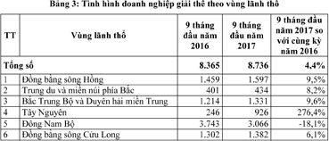 Về số doanh nghiệp quay trở lại hoạt động, trong 9 tháng đầu năm có 21.100 doanh nghiệp, tăng 2,9% so với cùng kỳ năm 2016. Trong đó, tỷ lệ doanh nghiệp quay trở lại hoạt động phân theo vùng lãnh thổ tăng cao nhất ở vùng Bắc Trung Bộ và Duyên hải miền Trung là 13,9% với 3.410 doanh nghiệp; ngược lại, vùng Đông Nam Bộ có tỷ lệ doanh nghiệp quay lại hoạt động giảm thấp nhất so với các vùng khác với 8.253 doanh nghiệp, giảm 1,6%.