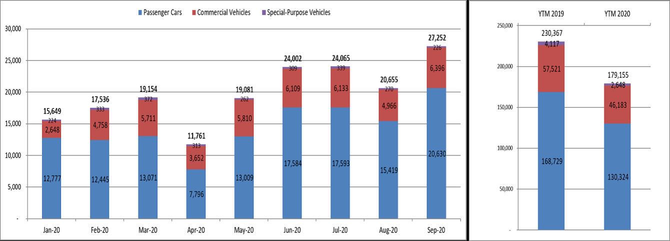 Cụ thể là, trong tháng 9/2020, sản lượng tiêu thụ ô tô toàn thị trường đạt 27.252 xe, bao gồm: 20.630 xe du lịch, tăng 34% so với tháng trước; 6.396 xe thương mại, tăng 29% và 226 xe chuyên dụng, giảm 16% so với tháng trước. Trong khi đó, sản lượng của xe lắp ráp trong nước đạt 17.826 xe, tăng 28% so với tháng trước và số lượng xe nhập khẩu nguyên chiếc là 9.426 xe, tăng 41% so với tháng trước.