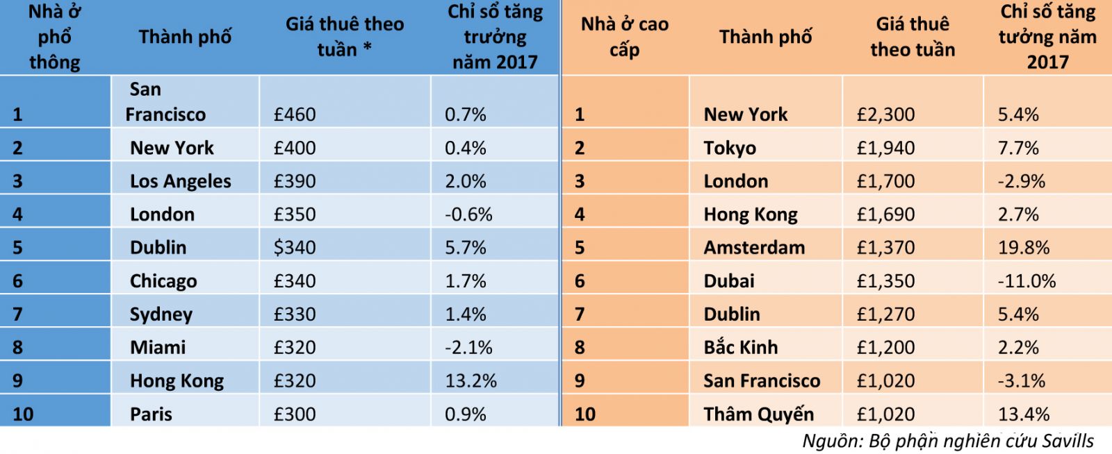 Trong khi đó, bảng xếp hạng các thành phố có giá cho thuê bất động sản cao cấp đắt đỏ nhất lại xướng danh những cái tên khác. New York đứng đầu với mức giá thuê 2,300 bảng Anh/một tuần, đắt hơn khoảng 5 lần so với giá bình quân của phân khúc phổ thông và hơn thành phố đứng thứ hai là Tokyo tới 400 bảng Anh/một tuần. Tương tự Tokyo, Trung Quốc không xuất hiện trong bảng xếp hạng phân khúc phía dưới, thế nhưng có tận hai thành phố của nước này là Bắc Kinh và Thâm Quyến đều xuất hiện trong bảng xếp hạng tại phân khúc cao cấp. Amsterdam cũng ở trong danh sách này với giá thành cho thuê tăng xấp xỉ 20% so với năm trước đó (Bảng).