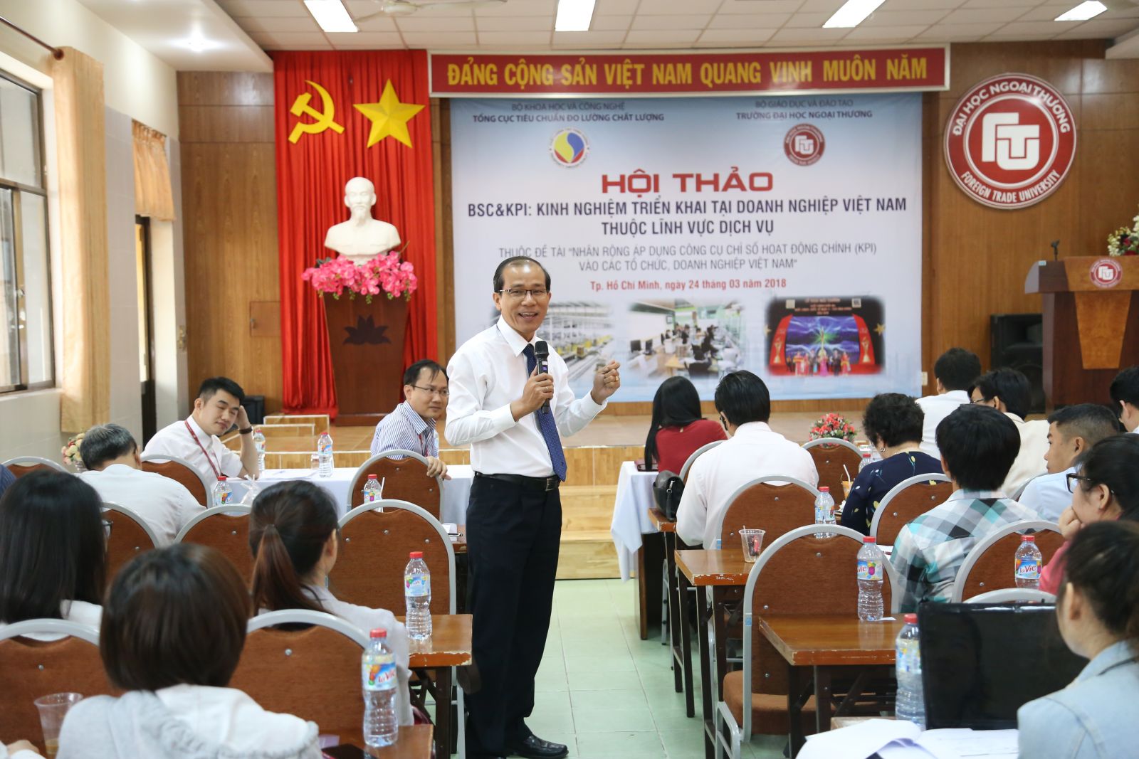 Phát biểu đề dẫn tại Hội thảo, PGS, TS Nguyễn Xuân Minh - Chủ nhiệm Đề tài nghiên cứu cho rằng trong nền kinh tế hiện đại, các doanh nghiệp muốn tồn tại và phát triển bền vững cần không ngừng đổi mới cả về sản phẩm lẫn cách thức quản lý, tuy nhiên nhiều doanh nghiệp tập trung chủ yếu vào đổi mới, cải tiến sản phẩm mà chưa chú trọng đến sự đổi mới về hoạt động quản trị doanh nghiệp. BSC và KPI là các công cụ quản lý đã được ứng dụng phổ biến trong lĩnh vực quản trị ở nhiều quốc gia phát triển nhưng vẫn còn khá mới mẻ tại Việt Nam, đặc biệt là đối với các doanh nghiệp vừa và nhỏ. Với 2 công cụ này, chiến lược kinh doanh của doanh nghiệp được cụ thể hóa thông qua các mục tiêu quản lý và chương trình hành động cụ thể cho từng bộ phận, từng lĩnh vực và từng cá nhân. Quá trình đánh giá nhân viên với hệ thống KPI sẽ trở nên công bằng và minh bạch hơn, đảm bảo cho người lao động thực hiện đúng các trách nhiệm trong bảng mô tả công việc của từng vị trí chức danh cụ thể. Với tư cách là đơn vị phối hợp, đại diện Trung tâm Hỗ trợ phát triển hợp tác xã, doanh nghiệp vừa và nhỏ miền Nam, Hiệp hội Điều Việt Nam và Viện Phát triển nguồn nhân lực Việt Nam – Nhật Bản đã đánh giá giá cao nỗ lực của Nhóm nghiên cứu trong việc thiết k nội dung chương trình hội thảo, tập huấn và kế hoạch lựa chọn, tư vấn triển khai ứng dụng KPI cho doanh nghiệp trên cả nước. Các đơn vị phối hợp bày tỏ sự tin tưởng và sẵn sàng hợp tác với Trường Đại học Ngoại thương để triển khai thành công Chương trình này. Đặc biệt, các bài tham luận tại Hội thảo của đại diện doanh nghiệp từ các phân ngành dịch vụ: giáo dục đào tạo, tư vấn, phân phối, vận tải, tài chính, ngân hàng đã đưa ra được bức tranh toàn cảnh về những kinh nghiệm thành công, thất bại và các khó khăn hiện hữu doanh nghiệp phải đối mặt trong quá trình triển khai KPI. Từ các ý kiến tham luận, các chuyên gia và các doanh nghiệp tham dự hội thảo đã trao đổi, bàn luận sâu hơn về những vấn đề mang tính kỹ thuật, cụ thể tương ứng cho từng loại hình doanh nghiệp, lĩnh vực kinh doanh và thảo luận để tìm ra các giải pháp phù hợp với thực trạng quản trị tại doanh nghiệp.