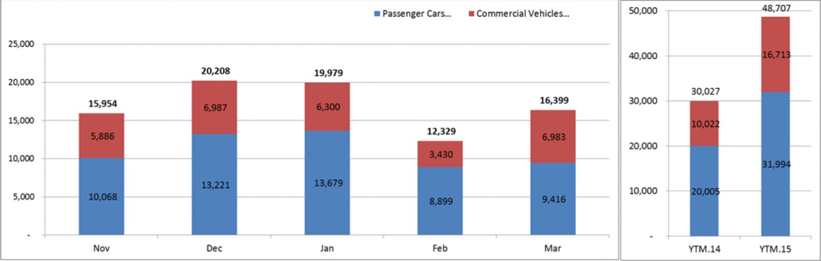 Nếu nhìn vào tổng sản lượng tiêu thụ trong tháng 4/2015 đạt 18.178 xe, tăng 11% so với tháng 3/2015 và tăng 60% so với tháng 4/2014. Chi tiết cho từng dòng xe như sau: 9.423 xe du lịch, tăng 0,1% và 8.755 xe thương mại, tăng 25% so với tháng trước. Trong khi đó, sản lượng của xe lắp ráp trong nước đạt 13.980 xe, tăng 9% so với tháng trước, số lượng xe nhập khẩu nguyên chiếc là 4.198 xe, tăng 19% so với tháng trước.