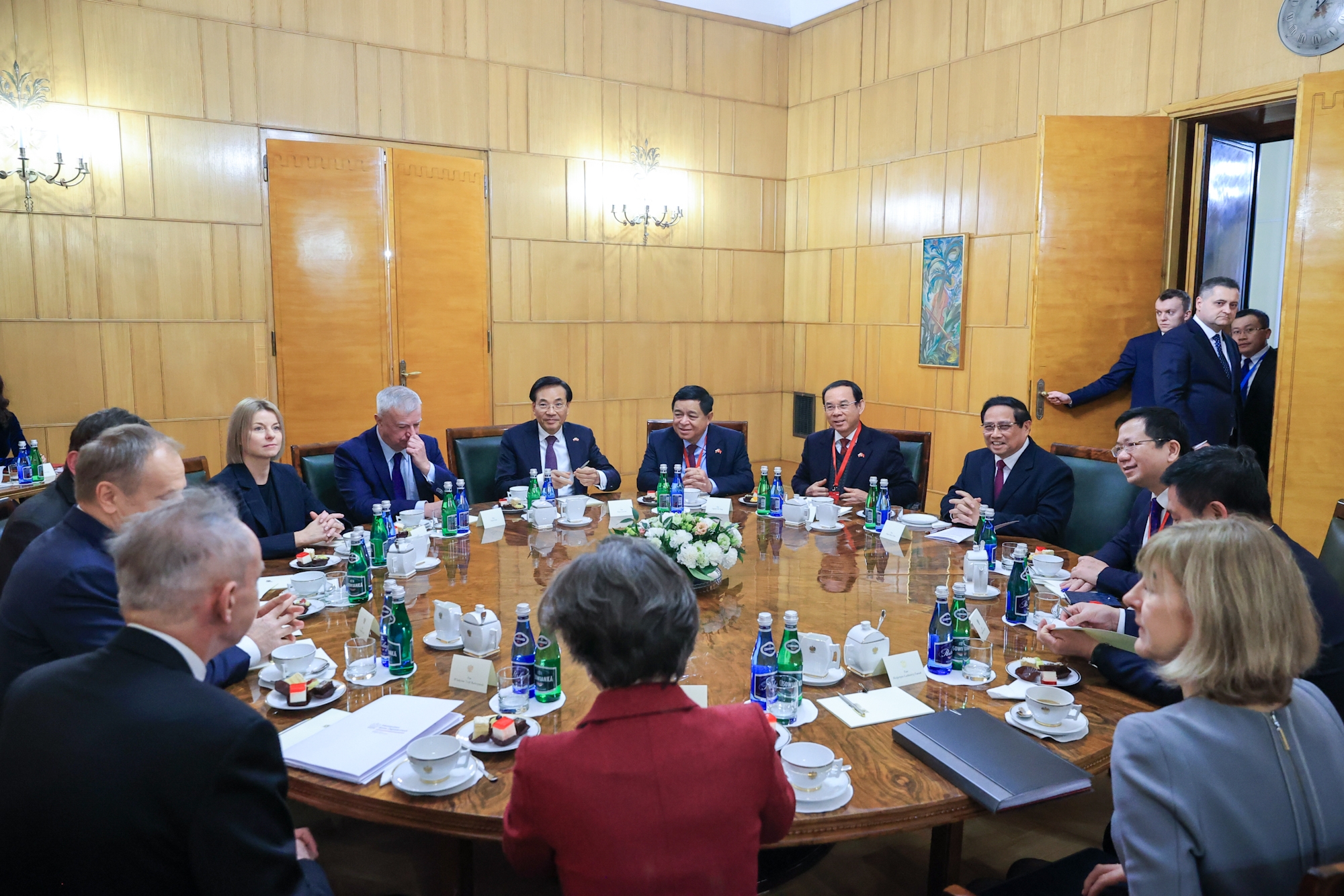 | Nhận lời mời của Thủ tướng Ba Lan Donald Tusk, Thủ tướng Chính phủ Phạm Minh Chính và Phu nhân cùng đoàn đại biểu cấp cao Việt Nam thăm chính thức Ba Lan từ ngày 16-18/1/2025. Tại hội đàm, Thủ tướng Phạm Minh Chính đề xuất với Thủ tướng Ba Lan Donald Tusk tăng cường tin cậy chính trị, hướng tới nâng tầm quan hệ hai nước lên Đối tác chiến lược trong thời gian tới, tiếp tục tăng cường tiếp xúc và trao đổi đoàn các cấp, nhất là cấp cao, trên tất cả các kênh Đảng, Nhà nước, Chính phủ, Quốc hội và giao lưu nhân dân. |