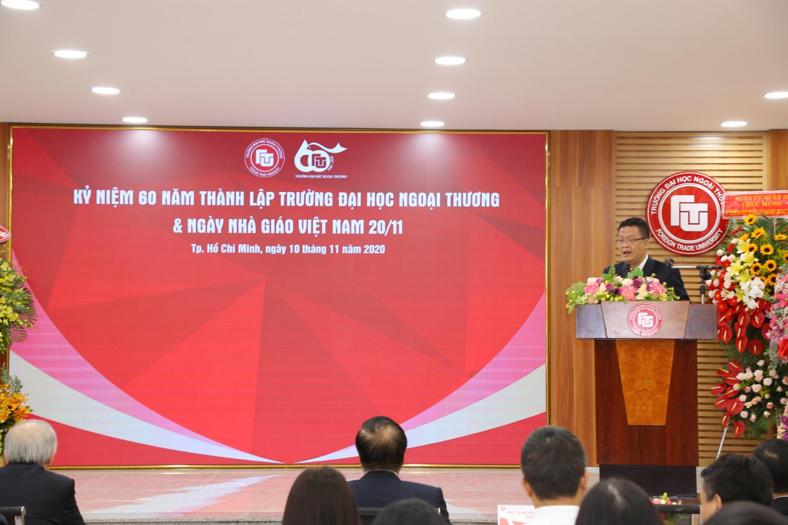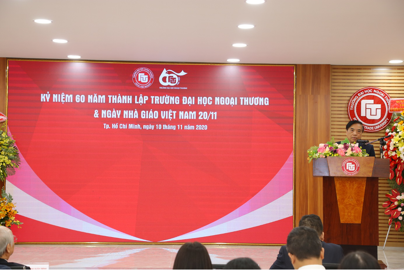 Tại buổi Lễ, PGS,TS Bùi Anh Tuấn – Hiệu trưởng Nhà trường đã thay mặt tập thể lãnh đạo Nhà trường phát biểu chào mừng kỷ niệm 60 năm thành lập Trường - đây là dịp ôn lại truyền thống vẻ vang của Nhà trường, là cơ hội cho các thế hệ Thầy, Trò gặp gỡ, giao lưu đồng thời nhìn lại những thành tựu đã đạt được, từ đó tiếp tục phát huy, nỗ lực hơn nữa trong sự nghiệp đào tạo nguồn nhân lực chất lượng cao, đáp ứng đòi hỏi và kỳ vọng của nhân dân, hoàn thành sứ mạng đối với sự nghiệp xây dựng, phát triển đất nước. Thầy gửi lời cảm ơn đến toàn thể các Cán bộ, viên chức, học viên và sinh viên Cơ sở II nói riêng, trường Đại học Ngoại thương nói chung đã và đang nỗ lực góp phần làm rạng danh Nhà trường.