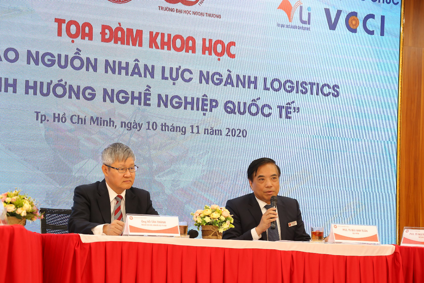 PGS TS Bùi Anh Tuấn – Hiệu trưởng Trường Đại học Ngoại thương cùng Ông Võ Tân Thành - Phó Chủ tịch VCCI, Giám đốc VCCI-HCM cùng điều hành buổi tọa đàm “Đào tạo nguồn nhân lực ngành Logistics định hướng nghề nghiệp quốc tế”