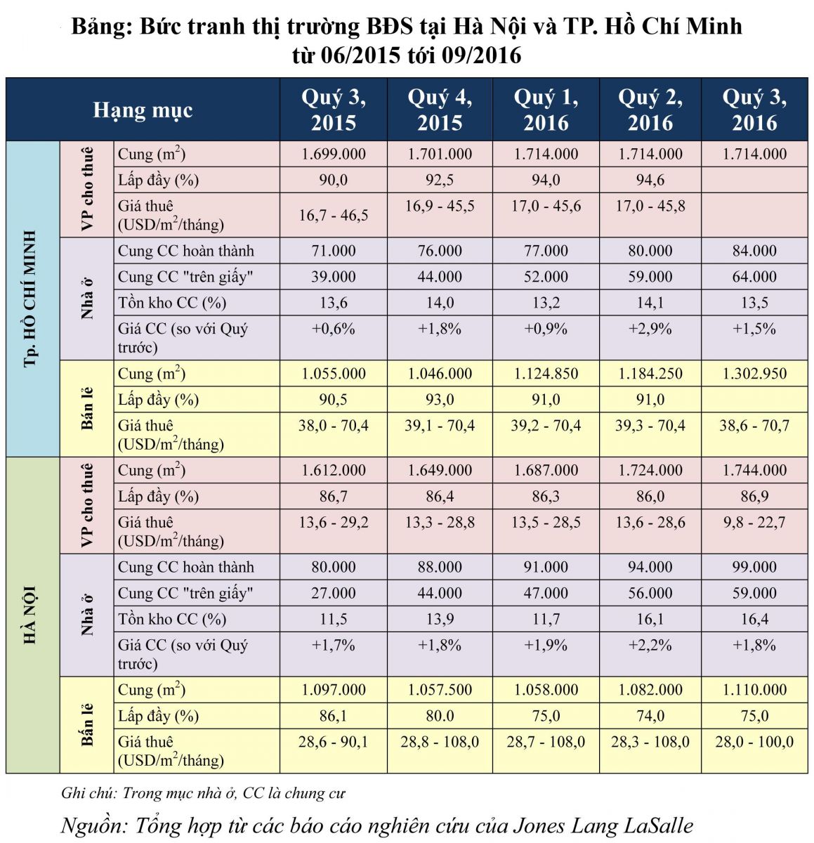 Phân khúc văn phòng cho thuê: Kể từ năm 2015 trở đi, cầu của phân khúc này tăng dần làm cho độ lấp đầy khá hơn. Tại TP. Hồ Chí Minh, cung của văn phòng cho thuê gần như không tăng trong năm 2016, tỷ lệ lấp đầy đạt tới khoảng 95%. Tại Hà Nội, cung tăng khoảng từ 20 nghìn tới 30 nghìn m2 mỗi quý, mức độ lấp đầy đạt khoảng 86%.