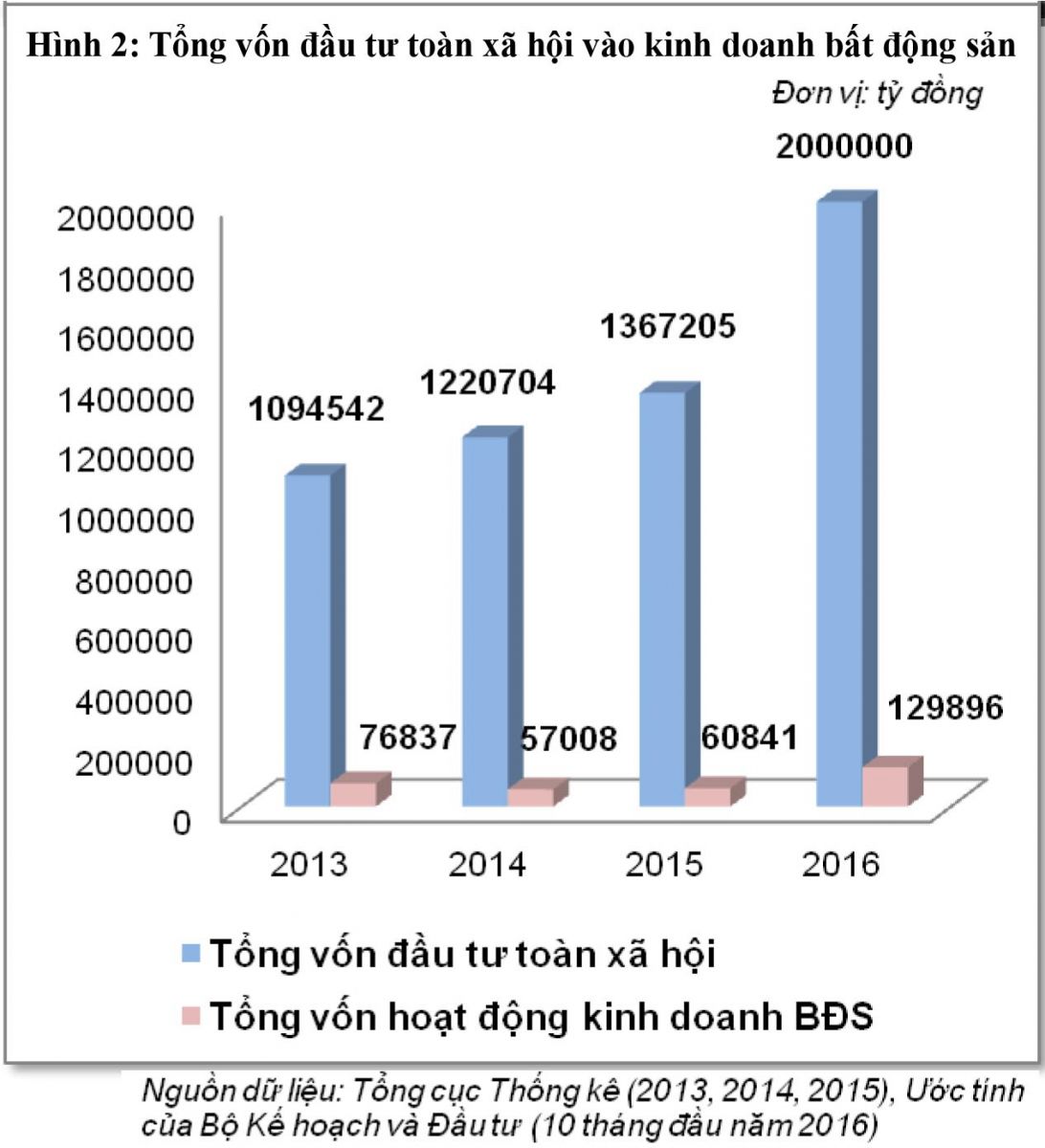 Tổng vốn đầu tư toàn xã hội có bước tăng khá cao vào năm 2016 (con số ước tính, không phải con số thống kê). Đây chính là kết quả của quá trình phục hồi kinh tế và chính sách của Chính phủ trợ giúp tích cực cho hoạt động của khối doanh nghiệp. Số lượng doanh nghiệp mới thành lập khá cao cùng với số vốn đăng ký đưa vào đầu tư cho sản xuất, kinh doanh. Trong lĩnh vực BĐS, số vốn đầu tư vào kinh doanh BĐS cũng tăng lên đáng kể so với những năm trước đó. Số lượng vốn đầu tư vào kinh doanh BĐS 10 tháng đầu năm 2016 được ước tính gần gấp đôi so với lượng vốn đầu tư trong năm 2015. Đây là dấu hiệu đáng mừng cho thị trường BĐS (Hình 2).