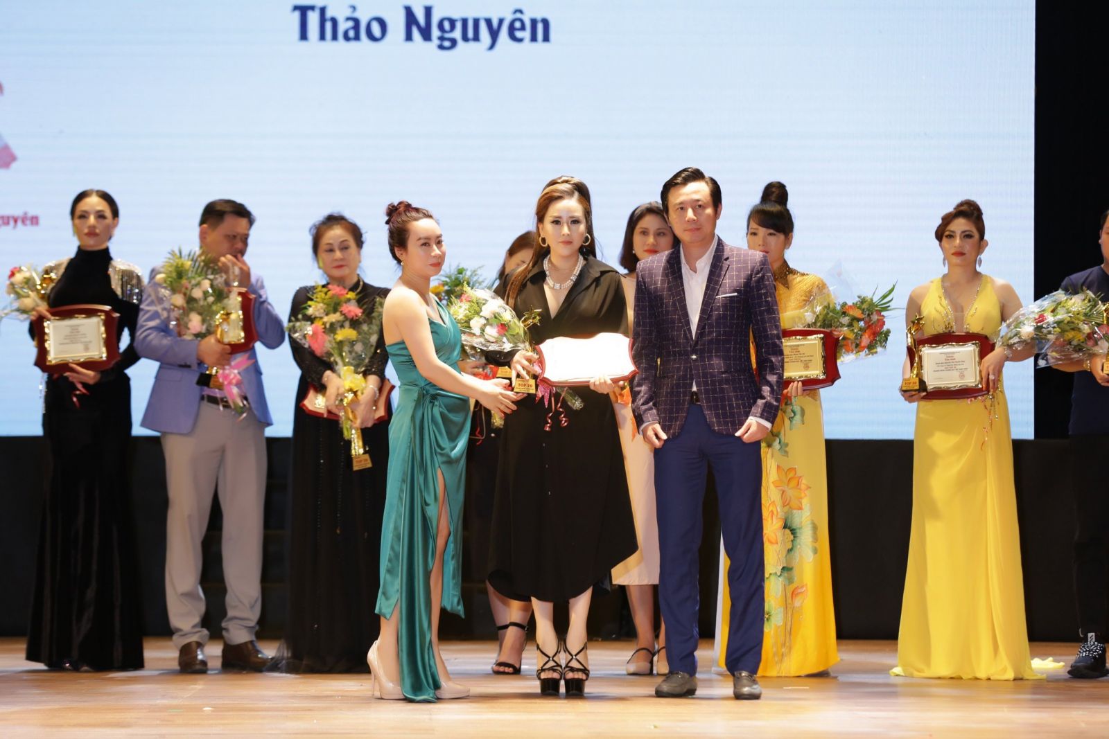 Nhà báo Vũ Tuấn Anh Tổng biên tập Thời báo Doanh nhân, trao cúp và chứng nhận Top 20 Doanh nhân thành đạt Việt Nam cho Hoa hậu Hoàng Thị Thảo Nguyên.