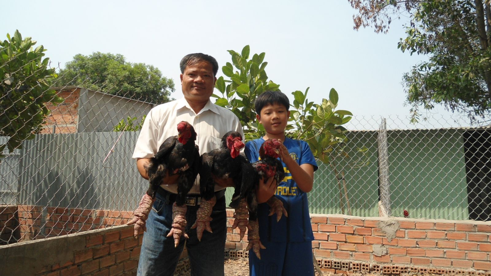 Anh Khái và con trai bên những chú gà quý Đông Tảo