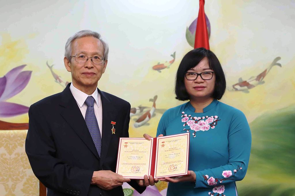 Thừa ủy quyền của Bộ trưởng Bộ Kế hoạch và Đầu tư, Giám đốc Quỹ Phát triển doanh nghiệp nhỏ và vừa Hoàng Thị Hồng trao Quyết định khen thưởng cho Chuyên gia tư vấn cấp cao Hàn Quốc Chung Bong-ik