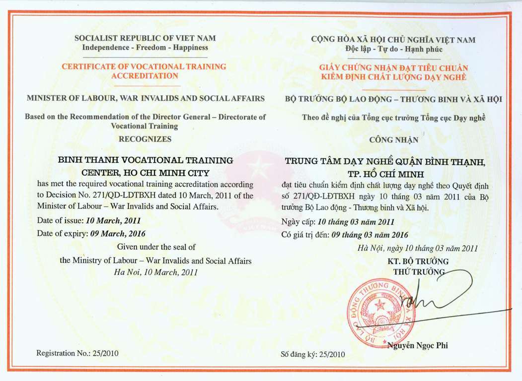 Chứng nhận đạt tiêu chuẩn kiểm định chất lượng dạy nghề của trường Trung cấp nghề Bình Thạnh