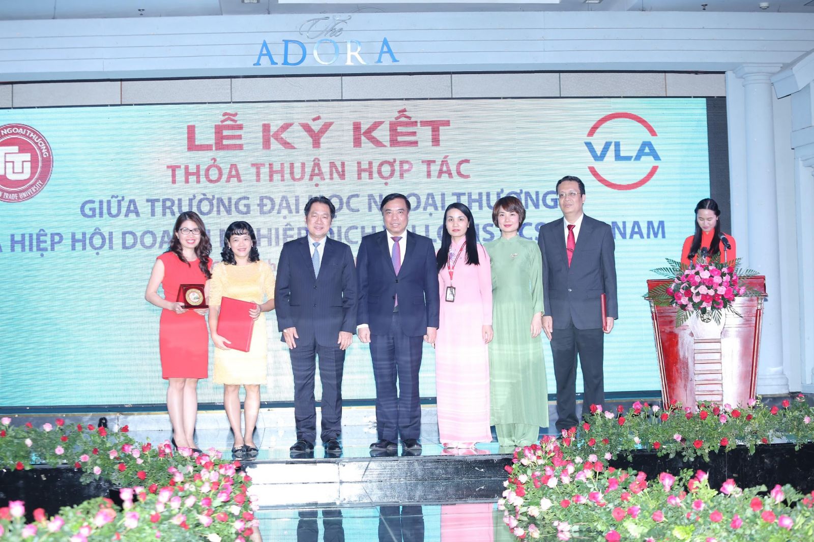 PGS,TS Bùi Anh Tuấn – Hiệu trưởng Trường Đại học Ngoại Thương và ông Lê Duy Hiệp – chủ tịch VLA thực hiện ký kết biên bản ghi nhớ với sự chứng kiến của các đại diện hai bên