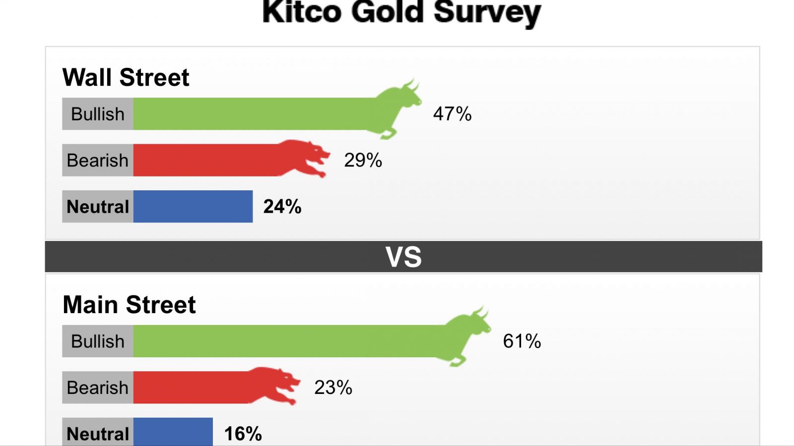 Cụ thể, cuộc khảo sát tại Wall Street cho kết quả, 47% ý kiến cho rằng giá vàng sẽ tăng, chỉ 29% dự báo giá sẽ giảm và 24% quan điểm trung lập. Còn tại cuộc khảo sát Main Street, có 61% ý kiến trả lời kỳ vọng giá vàng sẽ tăng, trong khi có 23% ý kiến dự báo giá vàng sẽ giảm và 16% cho rằng giá vàng sẽ đi ngang trong tuần tới.