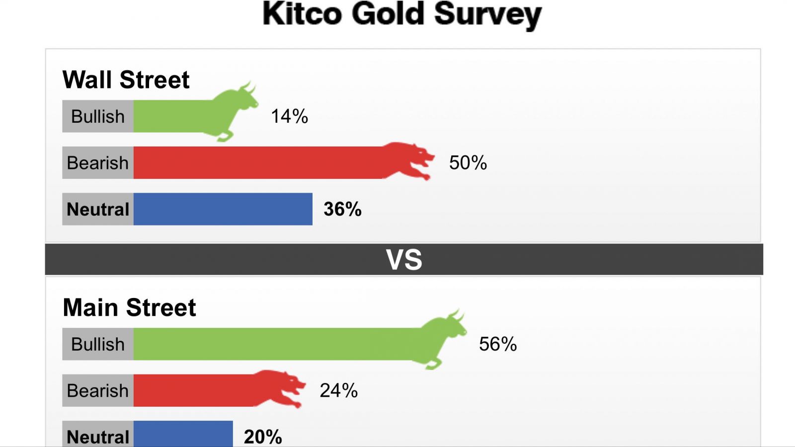 Cụ thể, cuộc khảo sát tại Wall Street cho kết quả, 14% ý kiến cho rằng giá vàng sẽ tăng, chỉ 50% dự báo giá sẽ giảm và 36% quan điểm trung lập. Còn tại cuộc khảo sát Main Street, có 56% ý kiến trả lời kỳ vọng giá vàng sẽ tăng, trong khi có 24% ý kiến dự báo giá vàng sẽ giảm và 20% cho rằng giá vàng sẽ đi ngang trong tuần tới.