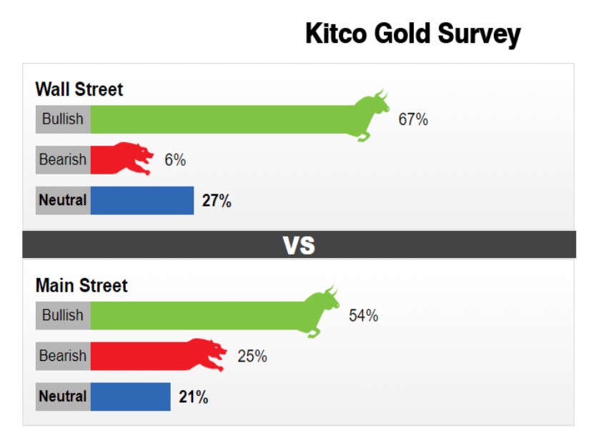 Cụ thể, cuộc khảo sát tại Wall Street cho kết quả, 67% ý kiến cho rằng giá vàng sẽ tăng, chỉ 6% dự báo giá sẽ giảm và 27% quan điểm trung lập. Còn tại cuộc khảo sát Main Street, có 54% ý kiến trả lời kỳ vọng giá vàng sẽ tăng, trong khi có 25% ý kiến dự báo giá vàng sẽ giảm và 21% cho rằng giá vàng sẽ đi ngang trong tuần tới.