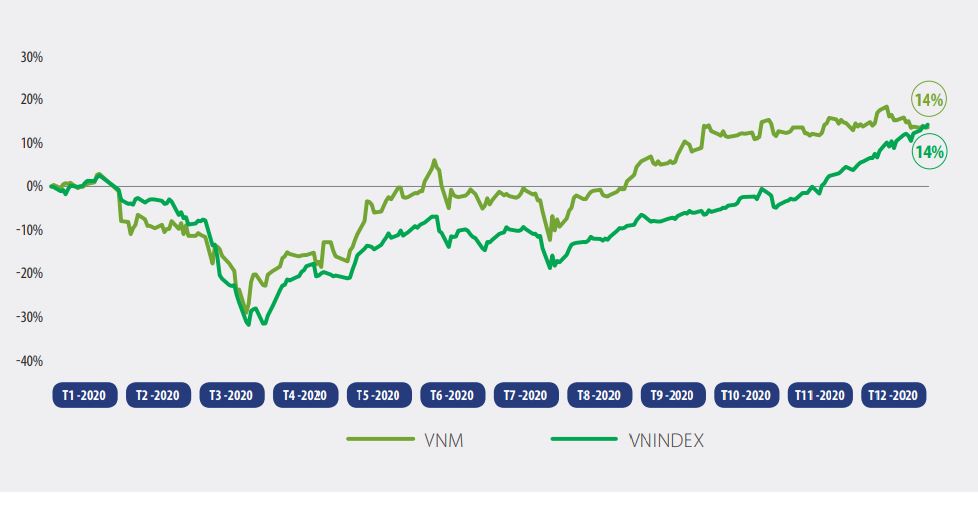 Diễn biến giá cổ phiếu VNM trong tương quan với VN-Index năm 2020