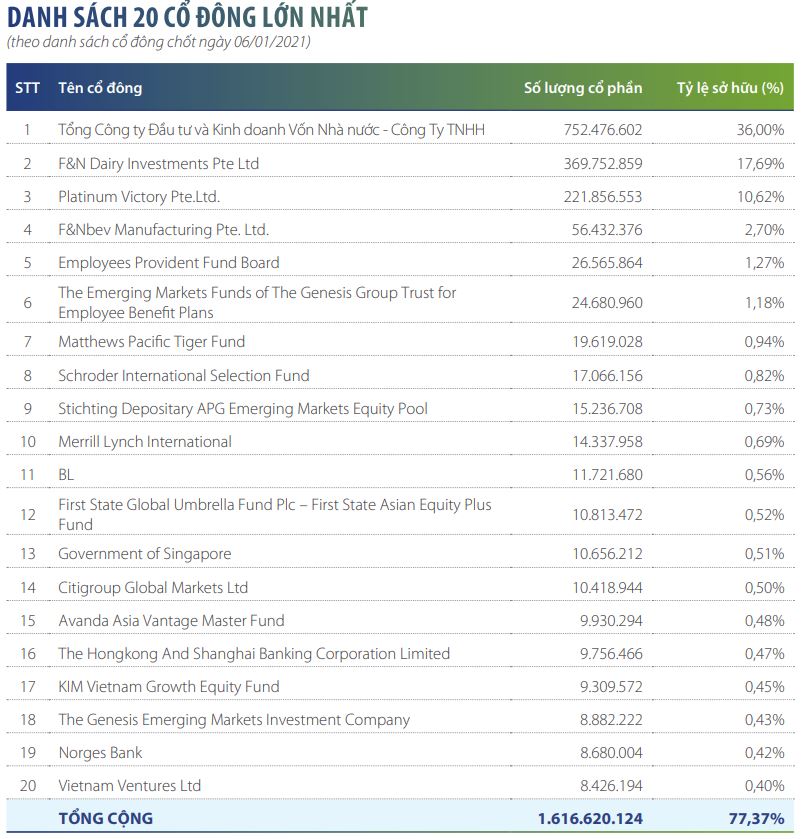 Trong cơ cấu cổ đông của của CTCP Sữa Việt Nam (Vinamilk), 20 cổ đông lớn nhất năm trên 77% vốn điều lệ Vinamilk.
