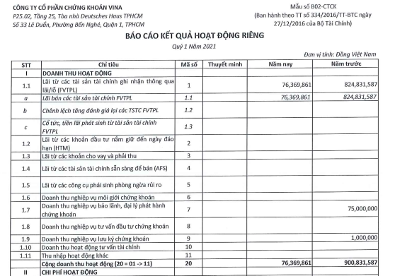 Theo báo cáo tài chính kiểm toán năm 2020, VinaSecurties chỉ đạt 6,3 tỷ đồng doanh thu, lỗ 69,2 tỷ đồng, trong khi các chỉ tiêu này của cùng kỳ năm trước lần lượt là 24 tỷ đồng và lãi 6,5 tỷ đồng. Tình trạng thua lỗ vẫn tiếp diễn trong quý I/2021, khi Công ty chỉ đạt khoản doanh thu bèo 76,3 triệu đồng, lỗ 8,9 tỷ đồng, các chỉ tiêu này của cùng kỳ năm trước lần lượt đạt 900 triệu đồng và lỗ 21,6 tỷ đồng.