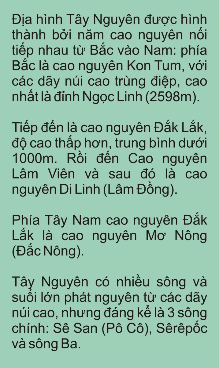 Tây Nguyên, hay cao nguyên miền Trung, hay cao nguyên phía Tây, ngay tên gọi của nó đã chỉ rõ tính chất và vị trí địa lý: cao nguyên miền Trung, phía Tây đất nước. Chạy dài từ vĩ tuyến 15 xuống đến vĩ tuyến 11, phía Bắc giáp tỉnh Quảng Nam, phía nam giáp tỉnh Bình Phước, đông giáp các tỉnh ven biển miền Trung Trung Bộ, tây giáp nước Lào và CamPuChia với biên giới chung dài khoảng 700 km. Bao gồm các tỉnh Gia Lai, Kon Tum, Đắk Lắk, Đắknông, Lâm Đồng. Là nơi sinh sống của các dân tộc anh em như Ba na, Ê đê, Gia rai, Giẻ chiêng, Xê đăng, Mơ nông, Cờ ho…