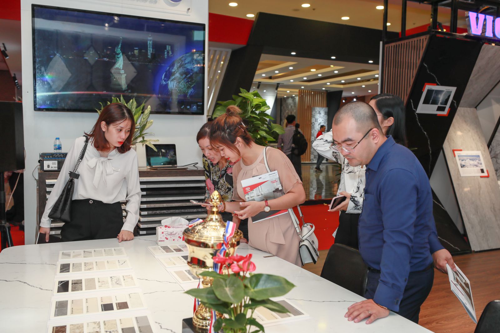 Khách hàng chiêm ngưỡng và cảm nhận tận mắt tận tay các sản phẩm đá VICOSTONE