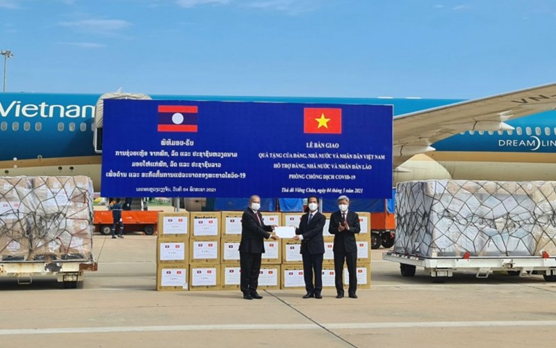 nhân dân Việt Nam gửi tặng Đảng, Nhà nước và nhân dân Lào 500.000 USD và tổ chức chuyến bay chuyên chở khẩn cấp số vật tư, thiết bị y tế gồm 2 triệu khẩu trang y tế, 200 máy thở và 10.000 kg hóa chất khử khuẩn Chloramine B để giúp Lào ứng phó với dịch Covid-19.