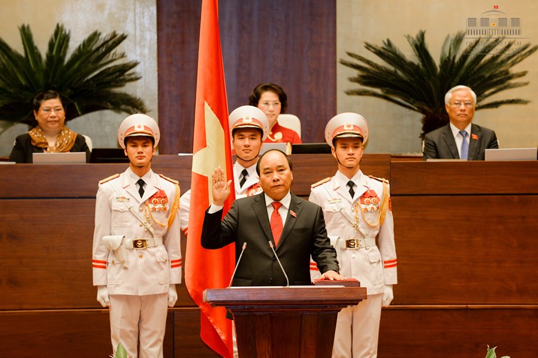Thực hiện nghi thức tuyên thệ khi nhậm chức, cảm ơn sự tín nhiệm Quốc hội dành cho mình, Thủ tướng Chính phủ Nguyễn Xuân Phúc tuyên thệ: "Trước cờ đỏ sao vàng thiêng liêng của tổ quốc, trước Quốc hội, trước đồng bào và cử tri cả nước, tôi xin tuyên thệ: Tuyệt đối trung thành với Tổ quốc, với Nhân dân, với Hiến pháp nước Cộng hòa xã hội chủ nghĩa Việt Nam. Tôi nguyện ra sức phấn đấu, rèn luyện để hoàn thành tốt các nhiệm vụ của Đảng, Nhà nước và Nhân dân giao phó".
