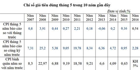 Như vậy, sau 5 tháng đầu năm, so với tháng 12 năm trước, CPI cả nước đã tăng 1,88%. Theo đánh giá của cơ quan thống kê, tháng 5 năm nay được ghi nhận là tháng có 11 nhóm hàng đồng loạt tăng giá so với tháng trước và cũng là tháng 5 có CPI tăng mạnh nhất trong vòng 3 năm qua (Bảng).
