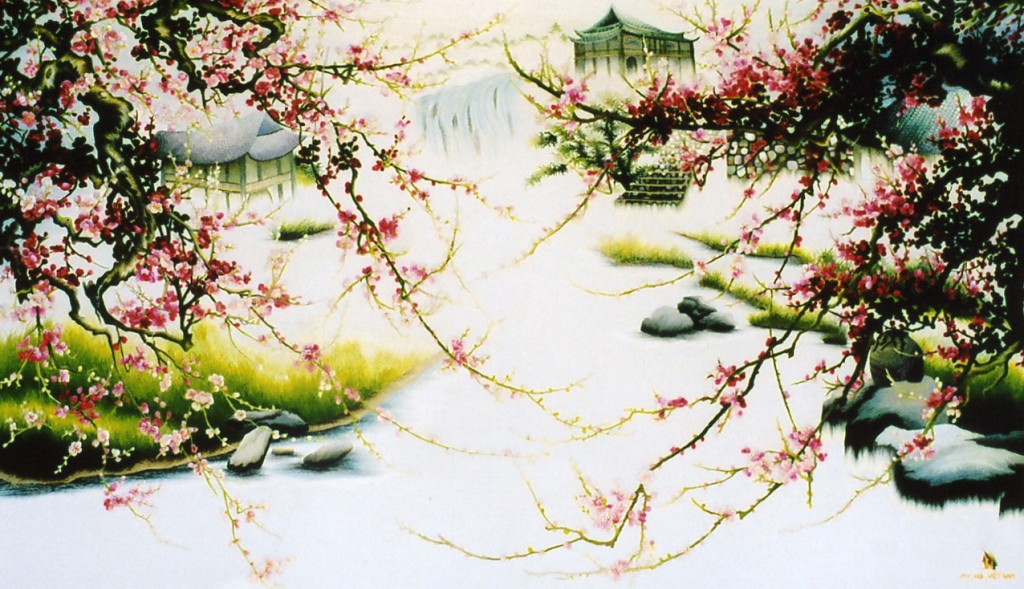 Bức tranh thêu: Bên thác hoa đào không rơi