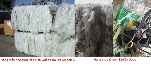 Anh S, giám đốc cty SHT kể lại một giao dịch nhập khẩu khiến anh thiệt hại hàng trăm triệu hồi năm kia. Anh đặt mua nhựa LDPE tỷ lệ 98/2 từ đối tác Hàn Quốc, nhưng khi nhận hàng về, mở container ra toàn rác. Ngoài túi nilon bẩn, người bán còn nhồi nhét thêm rất nhiều dây rợ, nhựa phế thải cho đủ trọng lượng. Tiền đã trả, anh S vừa không nhận được hàng như trong hợp đồng lại vừa mất công thuê người vứt rác. Anh S khiếu kiện, người bán bảo để từ từ trừ vào các lô hàng sau, nhưng sau cùng họ bảo anh: "Đi mà kiện!".